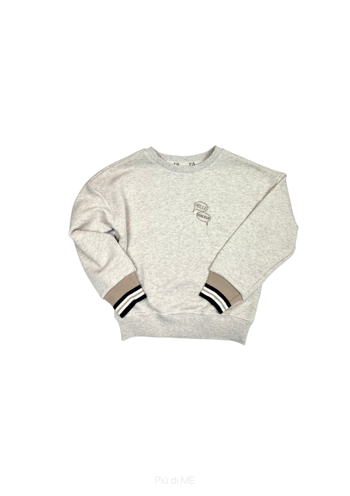 Bluza w kolorze beżowym z melanżem z ozdobnymi ściągaczami oraz haftem po boku "Hello, Boujour" Świetna do spódnicy, spodni i botków.