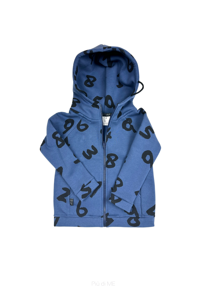 Bluza ZIP na zamek z kapturem w kolorze niebieskim z nadrukiem cyferek. Bluza posiada kieszonki, wykończona jest ściągaczami a z boku na rękawie znajduje się okrągła skórka z logo. Jest to super ciepła bluza na chłodne dni i wieczory z puszkiem od spodu.