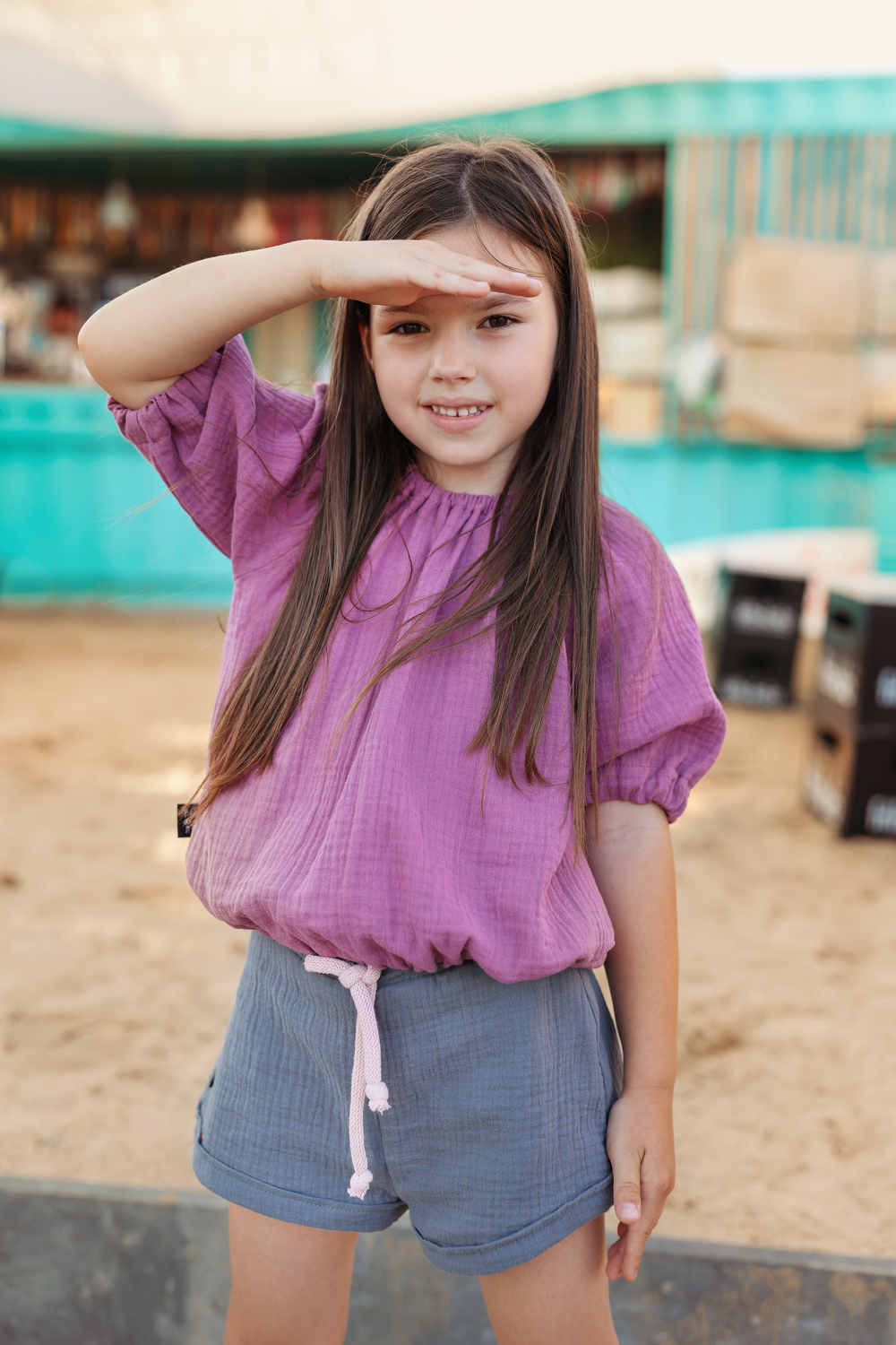 | Muślinowa bluzka hiszpanka , w kolorze jagodowym. Rękawki , dekolt i dół bluzki wykończony gumką. Drapowany model. 100% bawełna / GOTS |