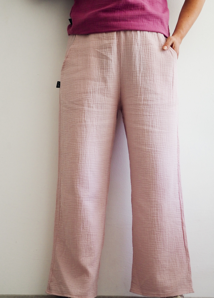 Długie spodnie z muślinu. W pasie znajduje się gumka, po bokach mieszczą się kieszonki.
