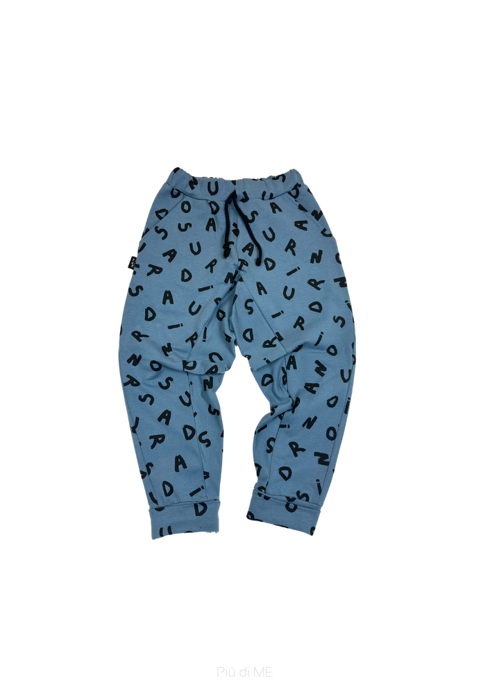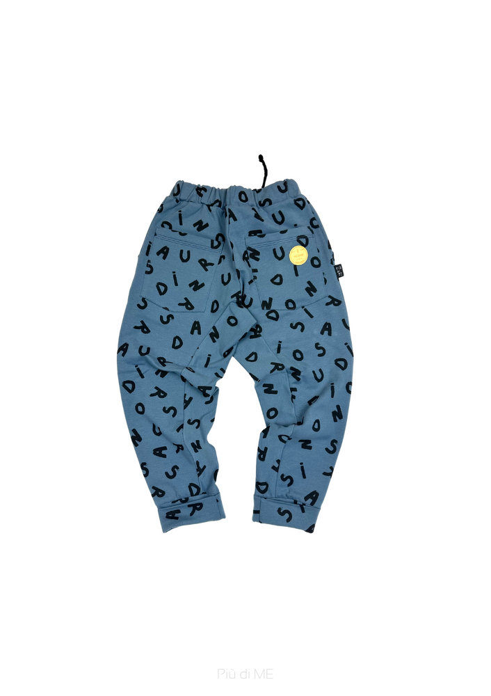 Spodnie o luźnym fasonie, z lekko obniżonym krokiem, wykonane z wygodnej dzianiny dresowej z puszkiem o średniej grubości. Po bokach i z tyłu posiadają kieszonki, w pasie gumka. Kolor niebieski z czarnymi literkami.