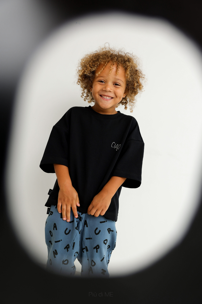 T-shirt o modnym, luźnym fasonie wykonany z wysokogatunkowej dzianiny typu singiel w kolorze czarnym. Na środku posiada haft "HI".