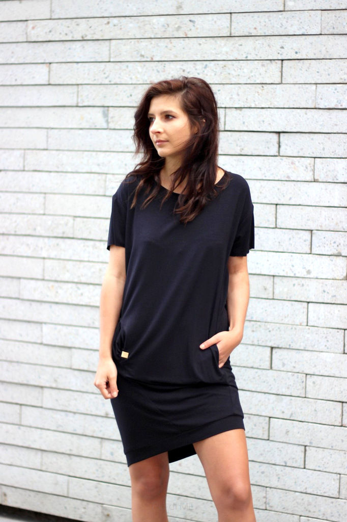 Czarna sukienka z kieszeniami po boku schowanymi w szwach bocznych. Dół zakończony ściągaczem - plisą.